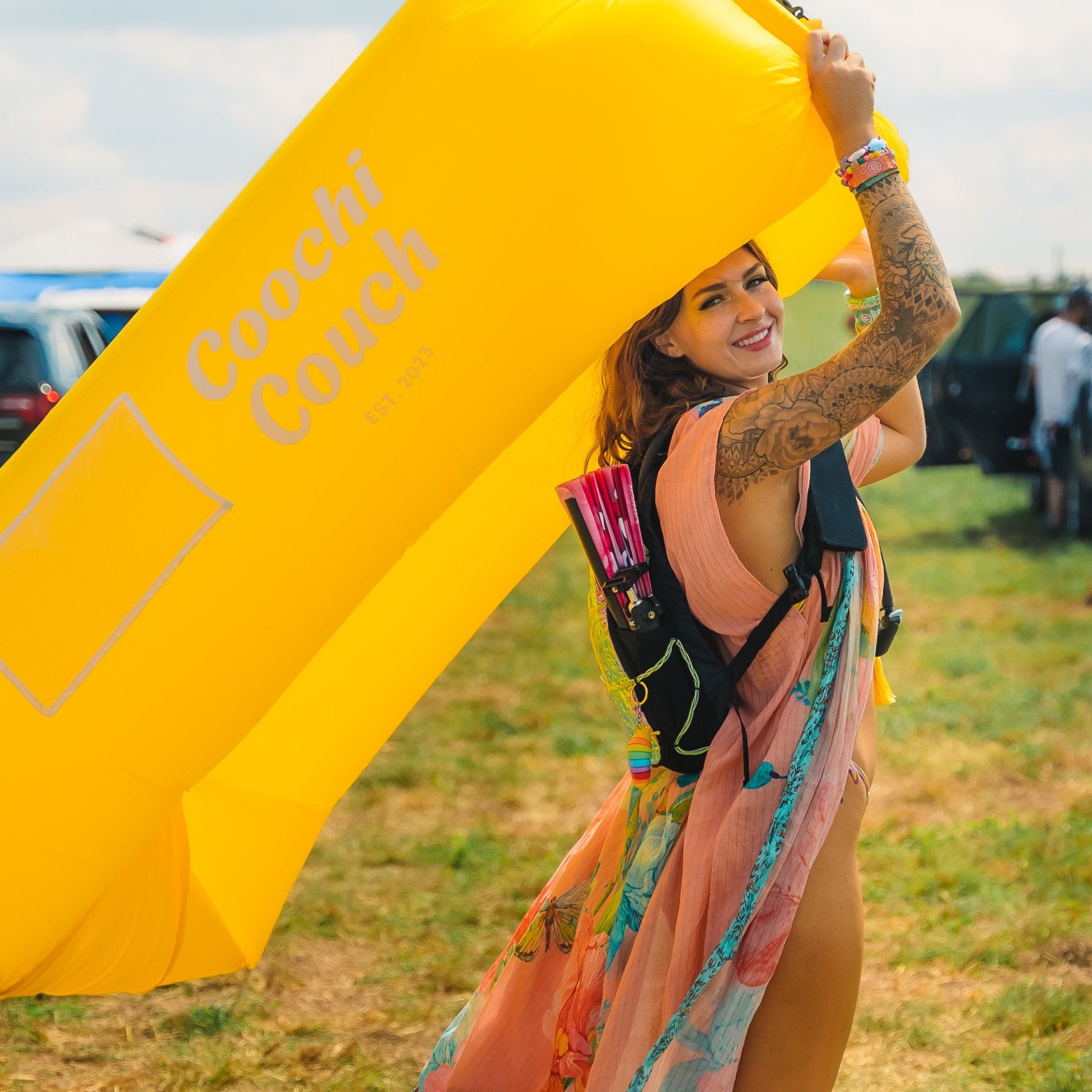 Experience unparalleled comfort wherever you go with the Coochi Couch - your ultimate solution for luxurious relaxation anytime, anywhere. Meticulously designed for effortless portability, the Coochi Couch features an adjustable strap and a remarkably lightweight build, making it fill with ease with just few strokes using the nothing but the air around you. Embrace the freedom of bringing it to any festival or event, thanks to its universal acceptance. Effortlessly fill it up using various methods, including the convenience of a fan, to suit any situation. The Coochi Couch is more than just a seat; it's a statement of comfort and ease, redefining the way you relax.
